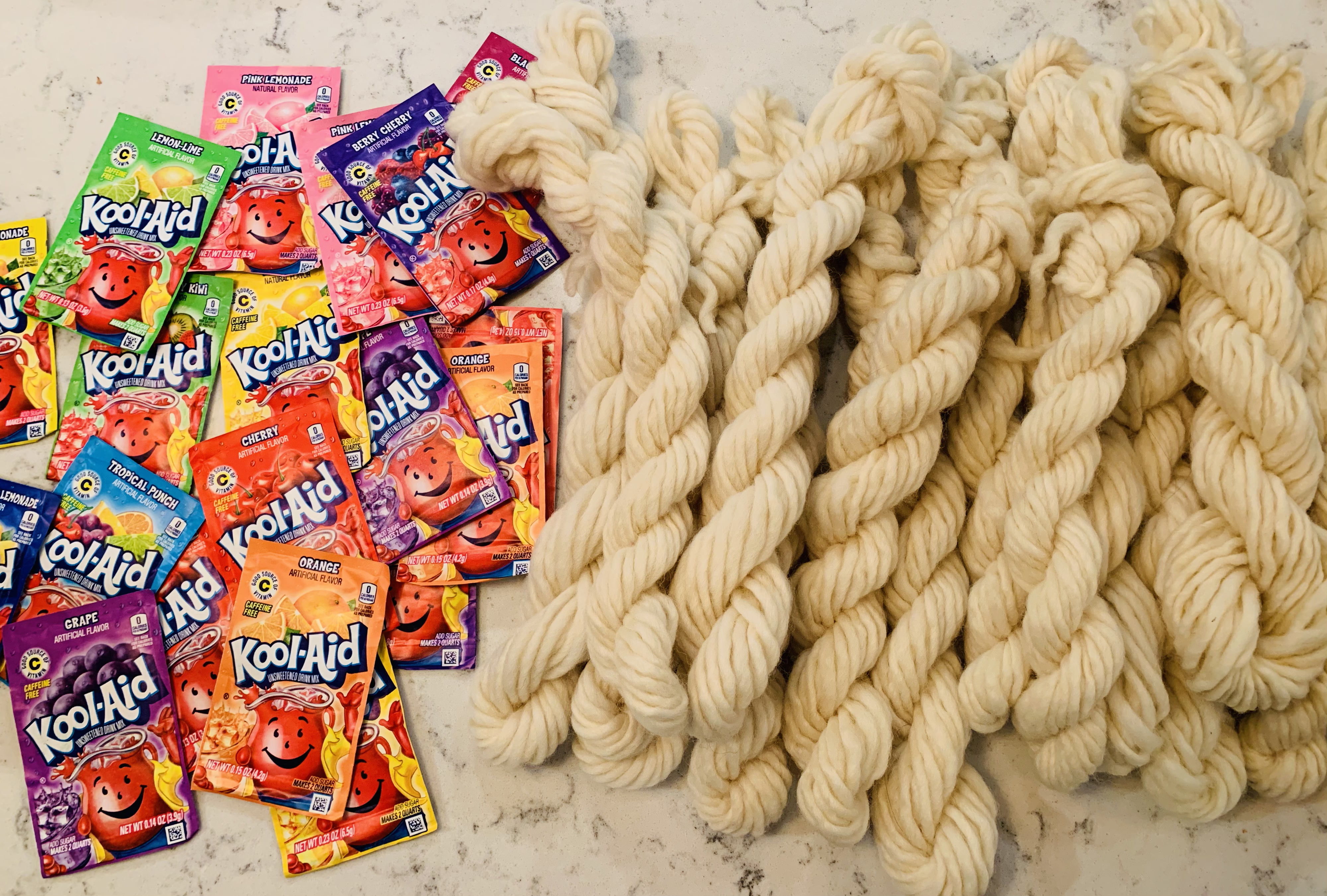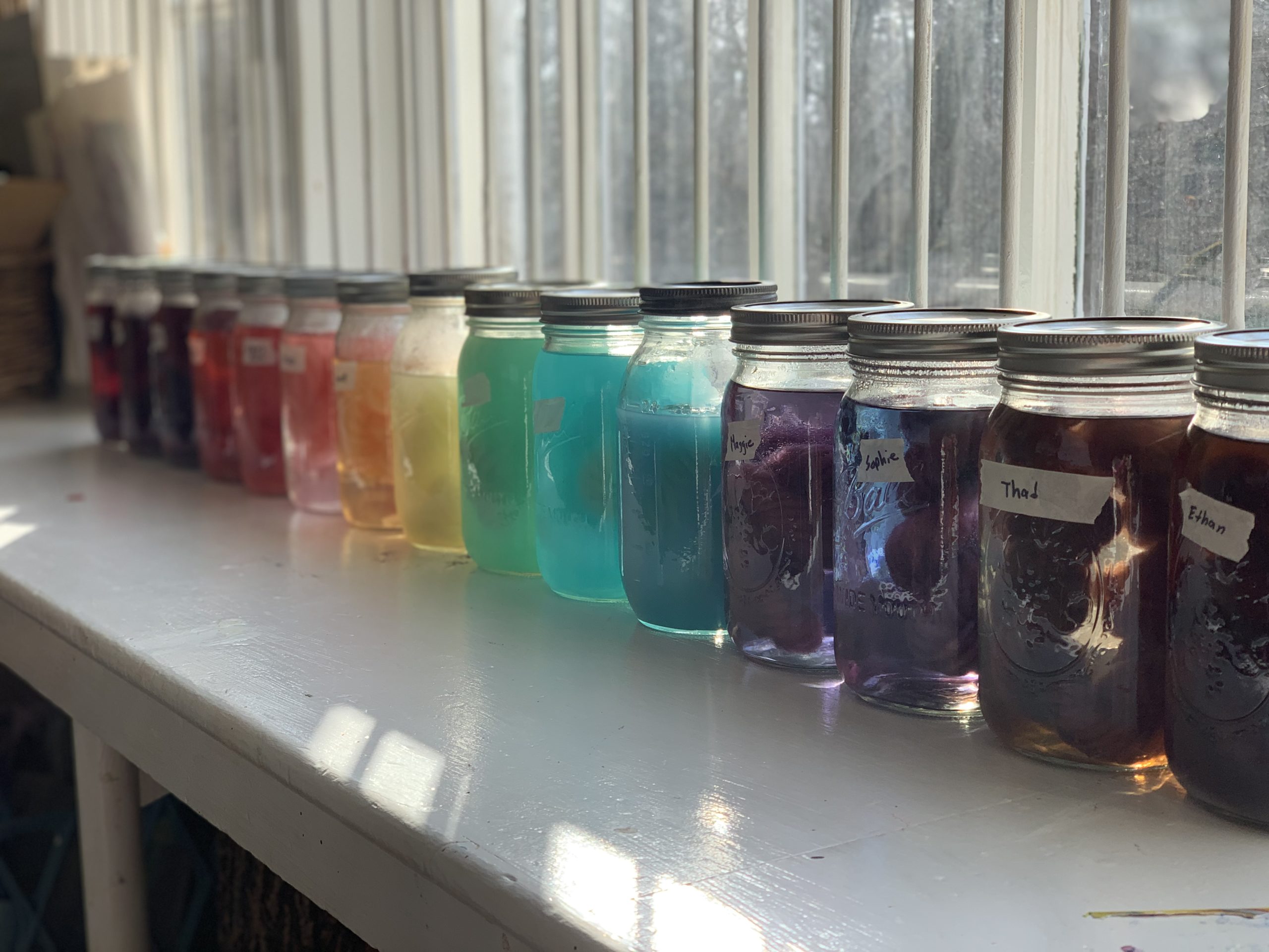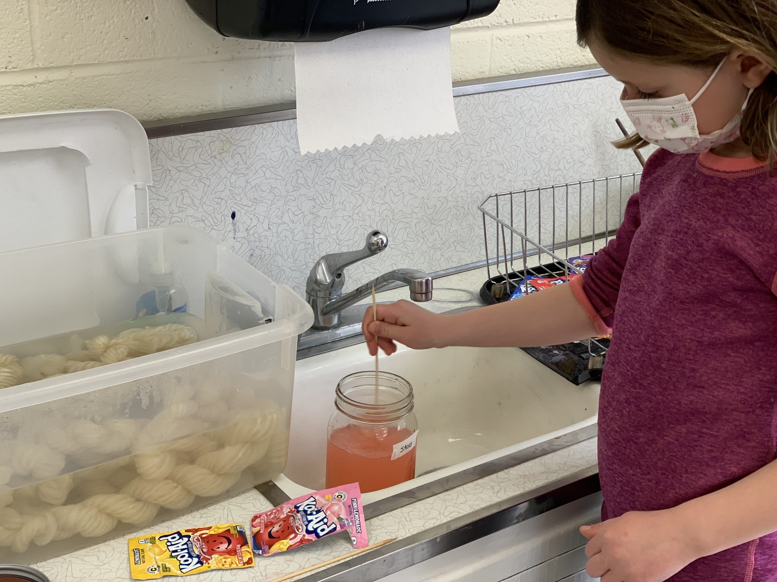 Beth Englert, Kinderbird mom and Art Chair for Meridian Hills Cooperative Nursery School & Kindergarten, has a passion for arts and crafts, especially weaving. She began a class weaving project by showing the Kinderbirds how to dye yarn using Kool-Aid. Each child selected their own color (flavor) and watched the yarn change to rainbow colors in jars.