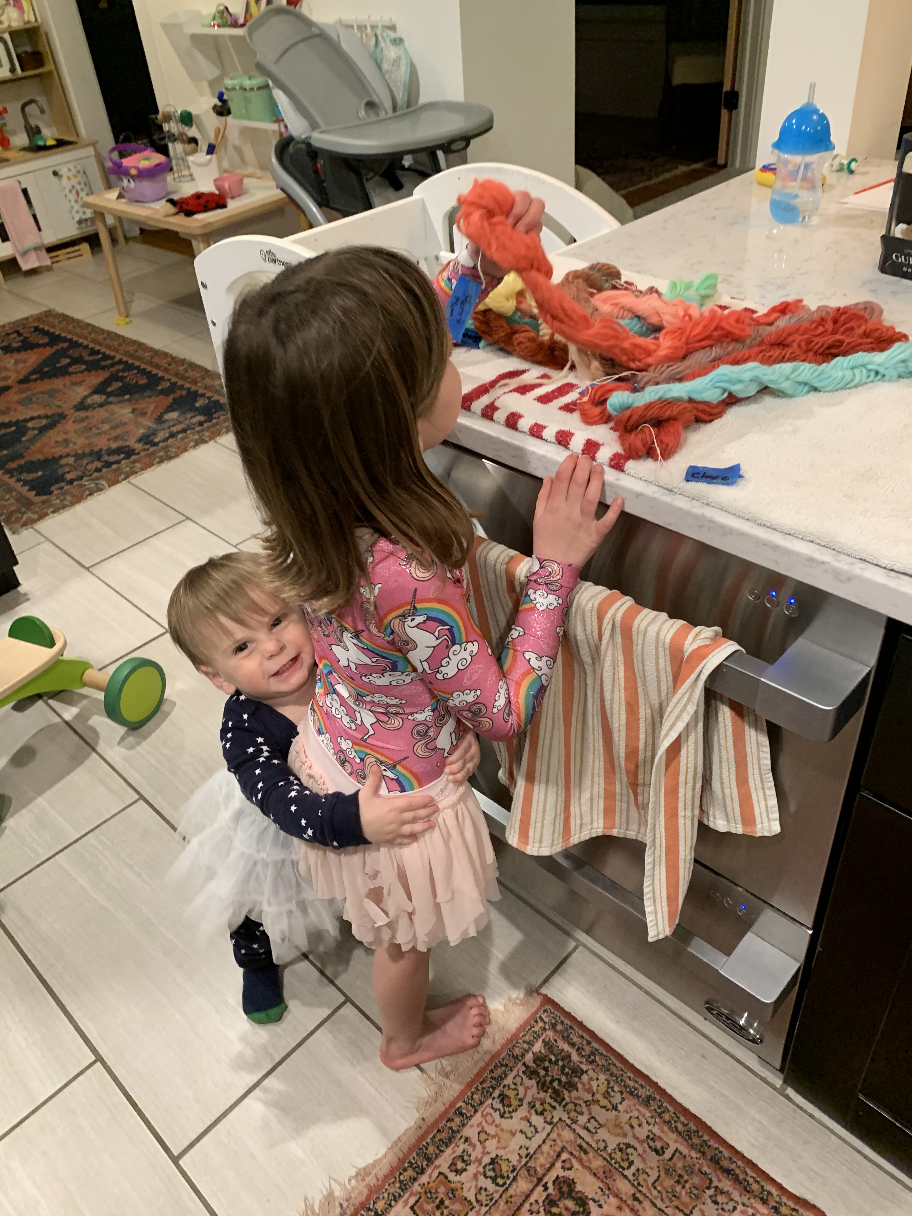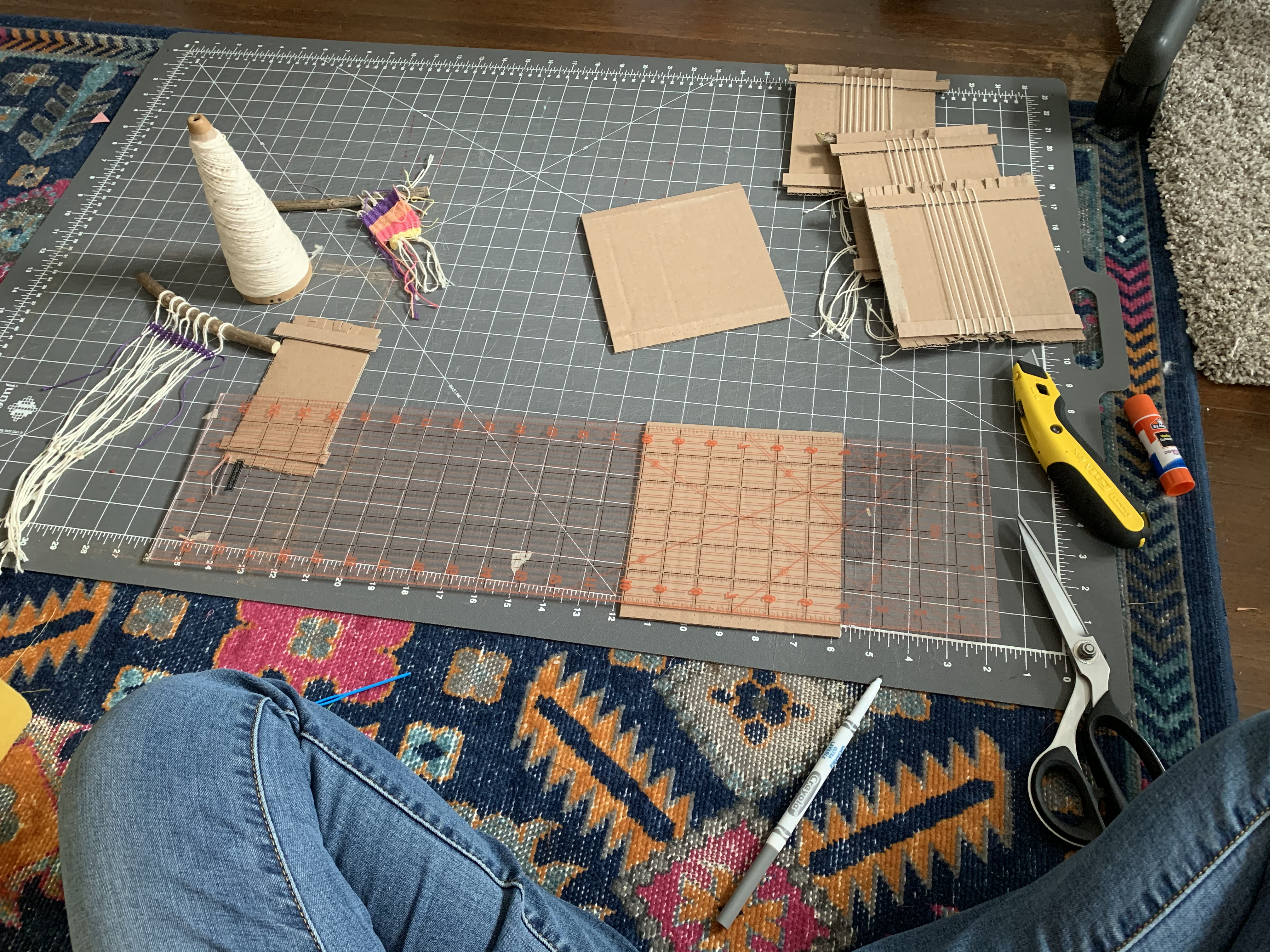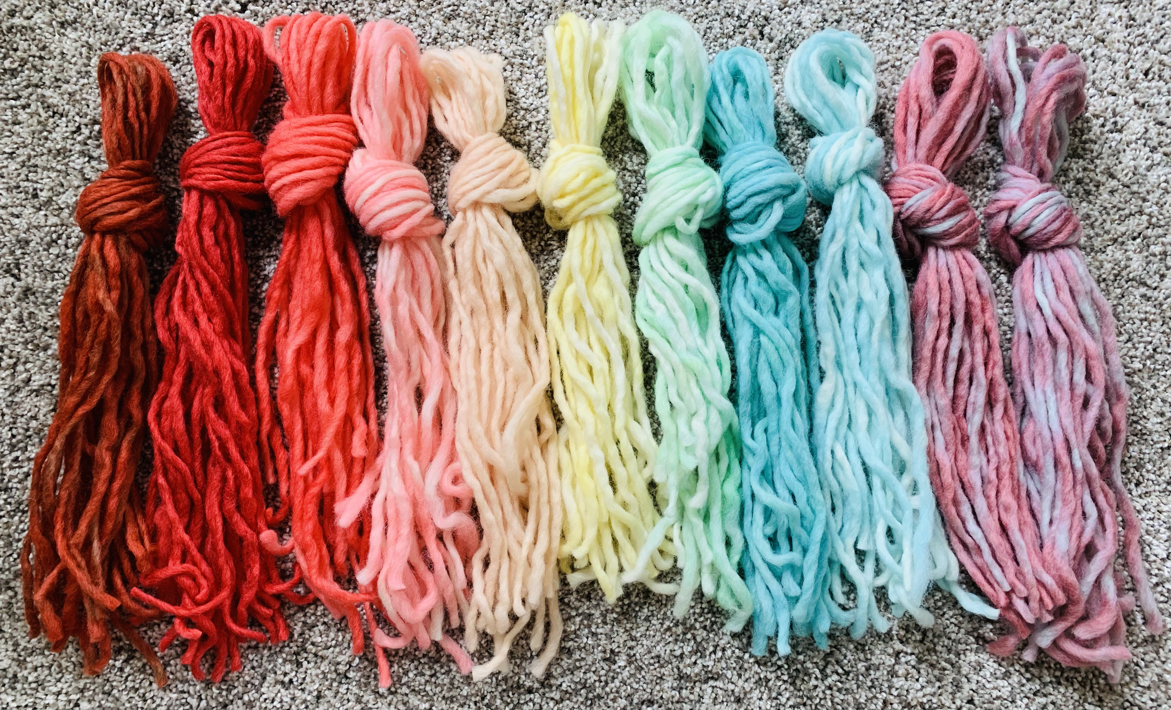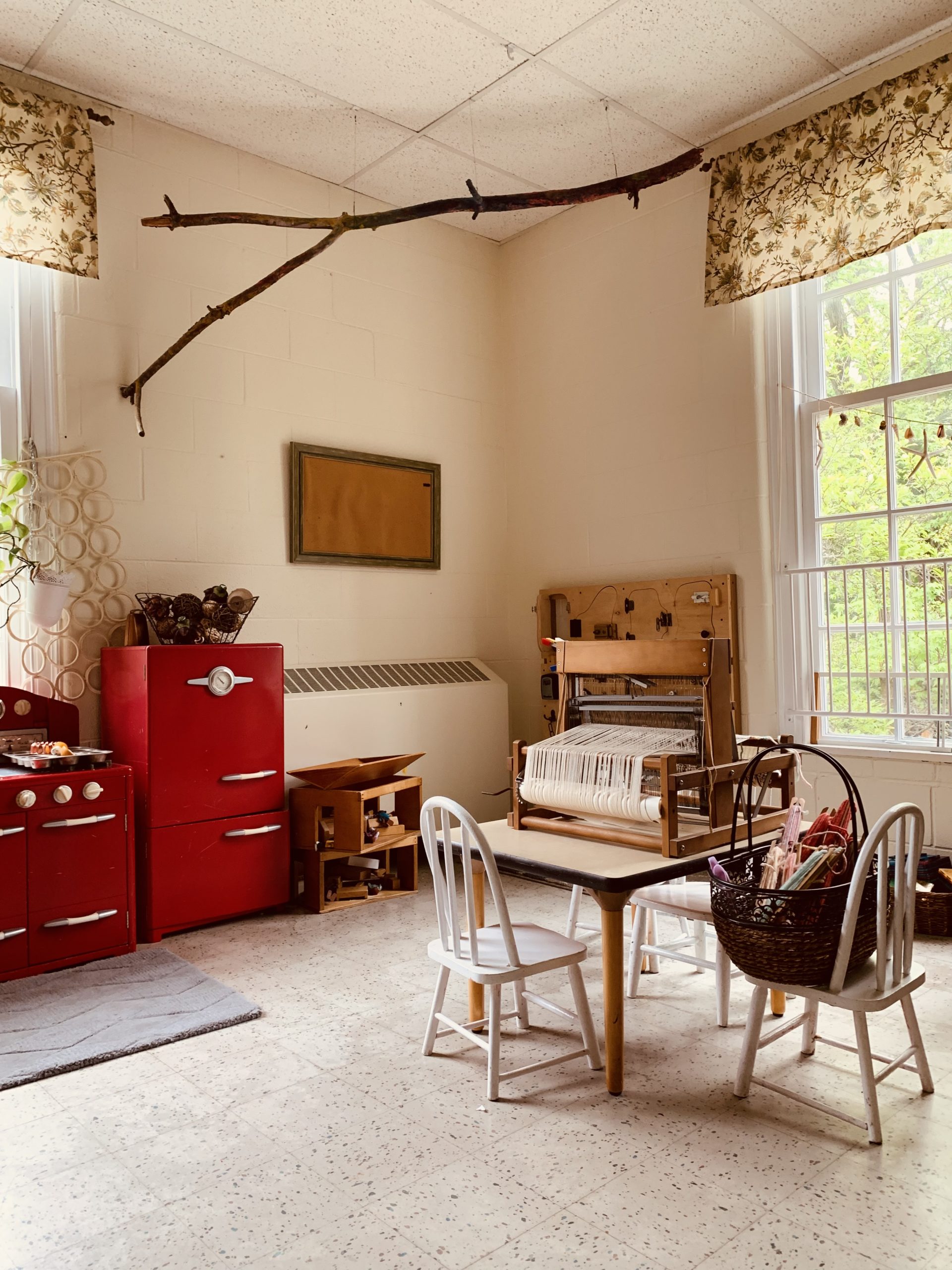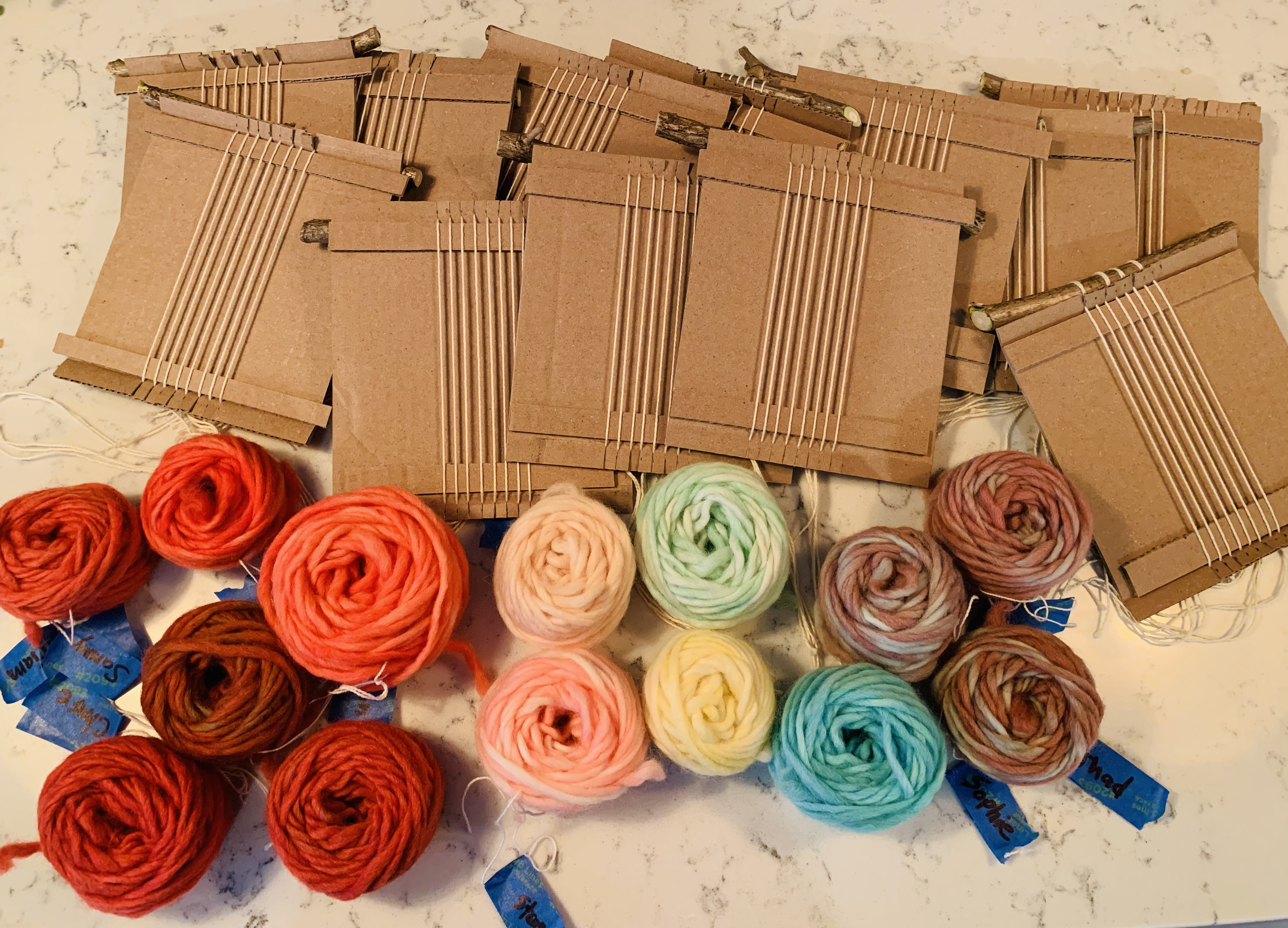 After the yarn soaked up the colors, Beth took it home to rinse and dry with the help of her two kiddos. For the second part of the project, the Kinderbirds got to do their own weaving. Beth took extra time to make each Kinderbird their own cardboard loom using recycled boxes and assisted the class with using their looms. They LOVED it and proudly displayed their weaving work in the giant window overlooking the playground.