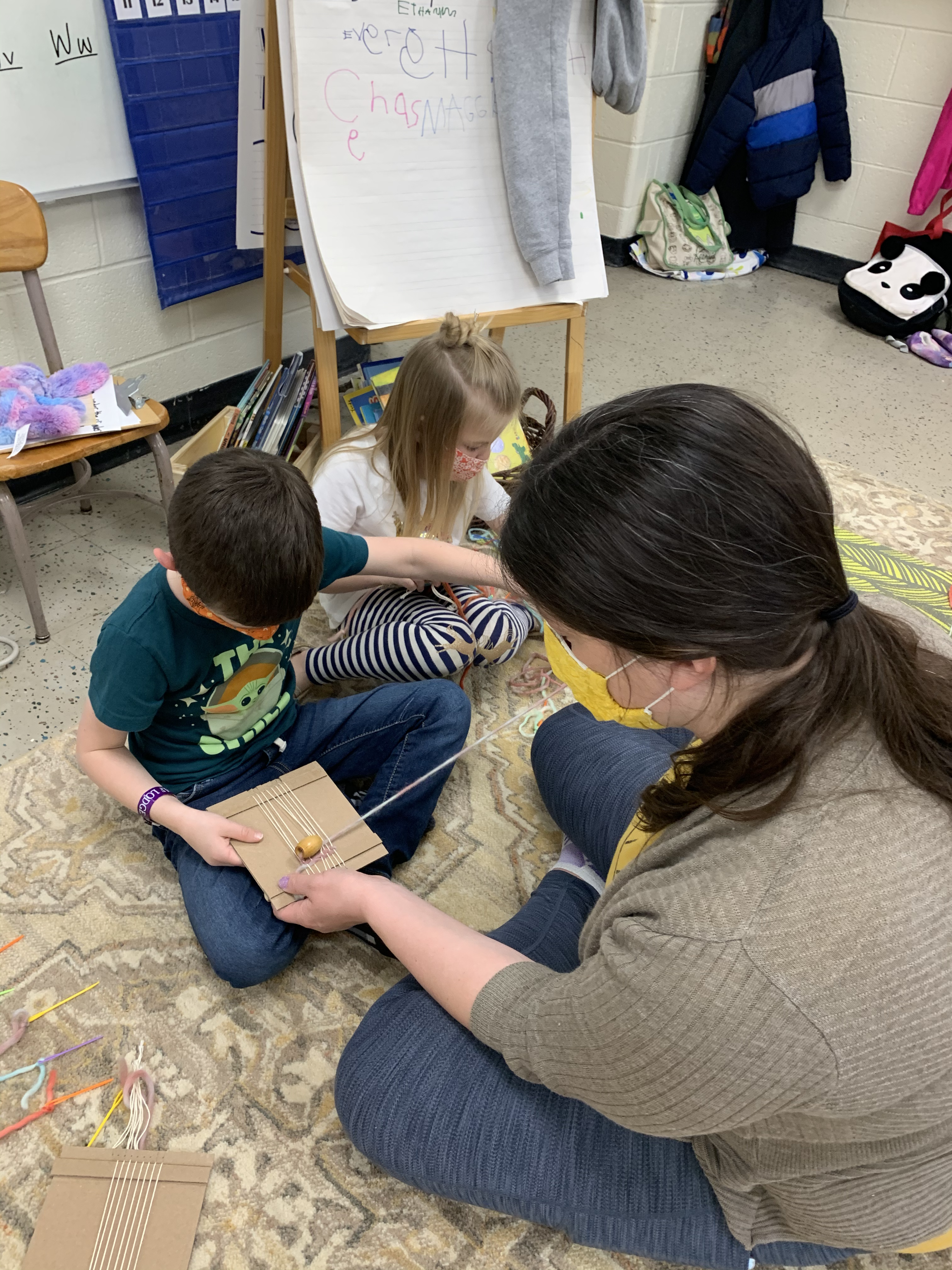 Our Kinderbirds (kindergarten) teacher, Mrs. Yordy, welcomes all ideas to enrich the classroom experience. So, when a Kinderbird mom wanted to share her weaving talents with the class, Mrs. Yordy enthusiastically collaborated to organize the idea into a project!