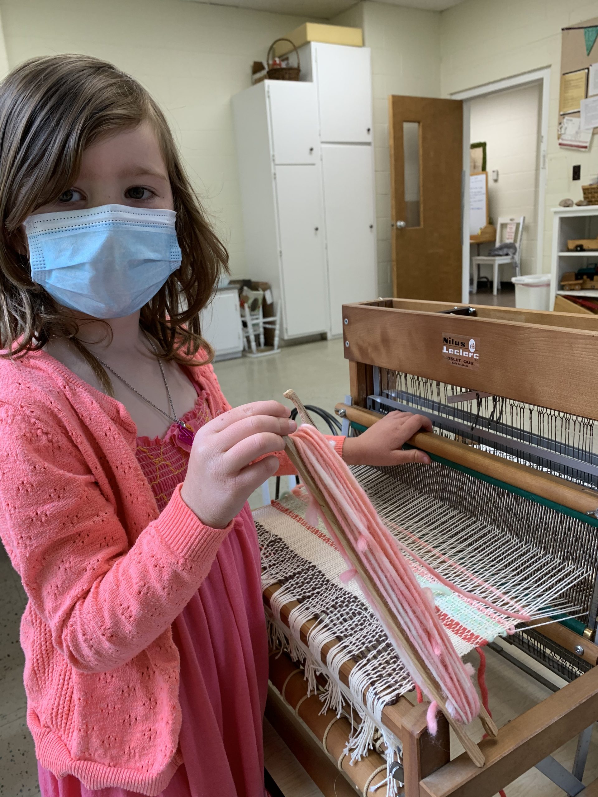 For the final part of this invitation to weave, Beth brought in her own table loom. The kiddos learned how the warp (the yarns attached to the loom) is wound onto the loom and threaded individually in a predetermined way to create the pattern you want. Through hands-on experience, they observed how levers control the shafts, which lift certain yarns at a time. They used only two shafts to create a “plain weave/tabby weave,” which was the simple over/under pattern they practiced on their cardboard looms.